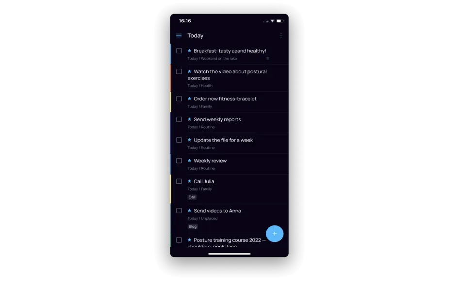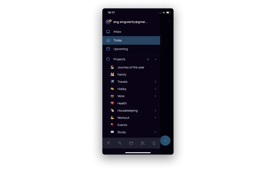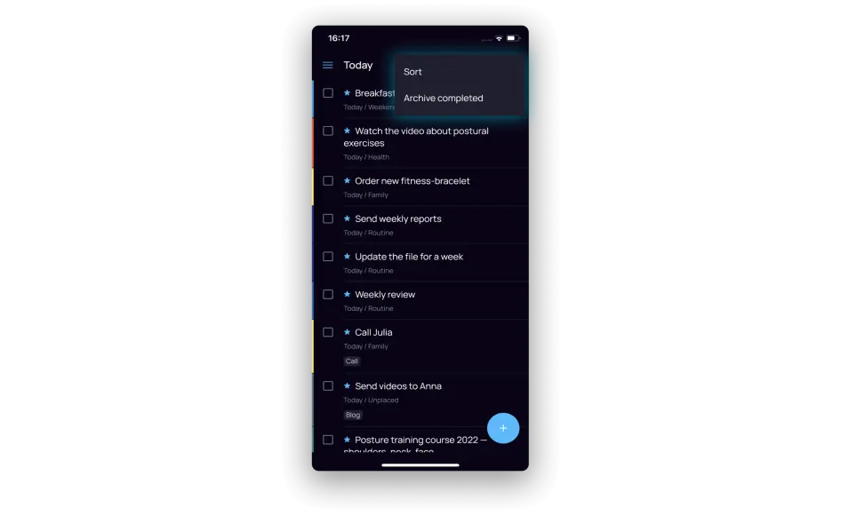 When you launch the app, it always greets you on the «Today» tab. The menu is always available to you at the top left. On the right there is an icon that hides manual sorting or archiving of completed tasks.