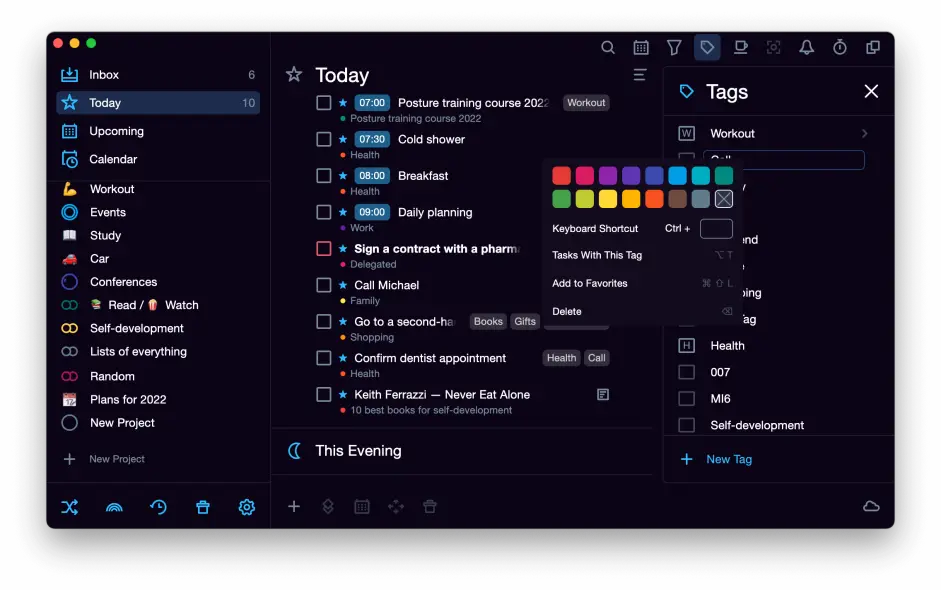 To remove a tag, click on it and press Delete or Backspace, or select Delete from the context menu. The tag will be removed from the tag panel, as well as for all the tasks it was specified for.