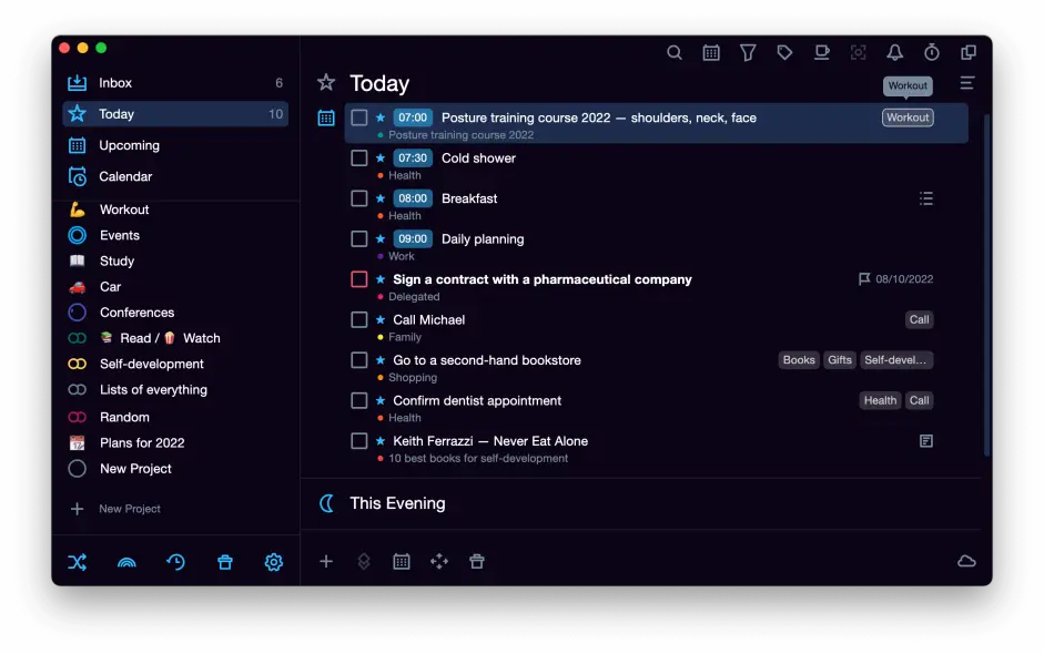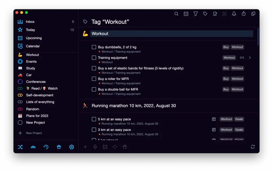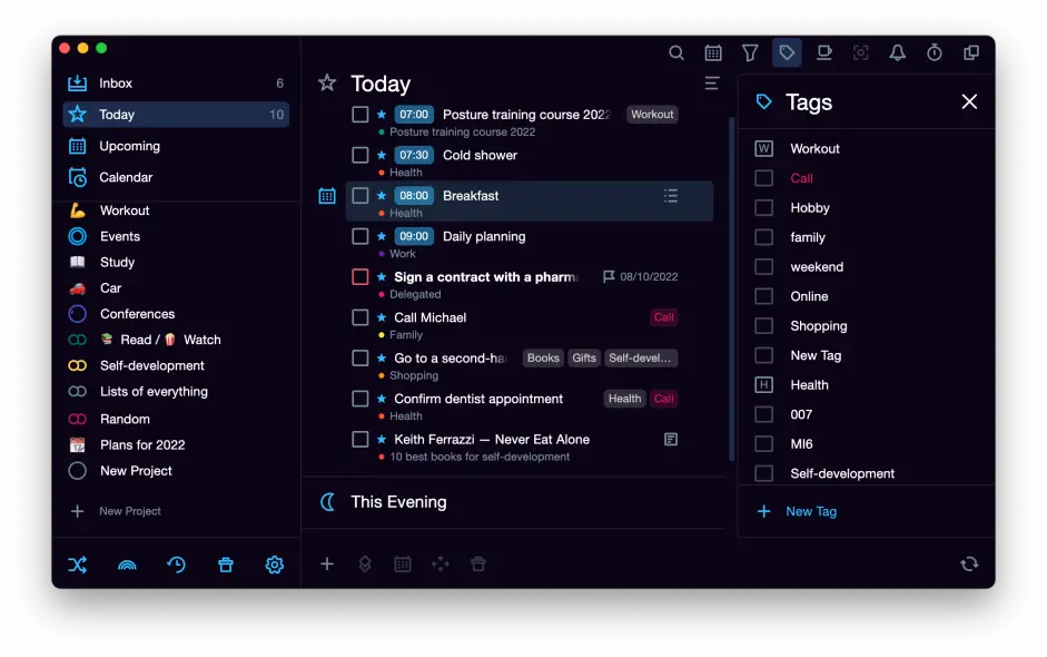 Click on any tag in the tag panel — the application will display all tasks with this tag in the current list. You can select several tags at the same time (holding Shift or Ctrl). The selected tags are displayed on the right of the folder name.