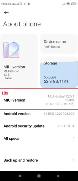 - At the top of the screen, you’ll see information about your MIUI and Android versions.